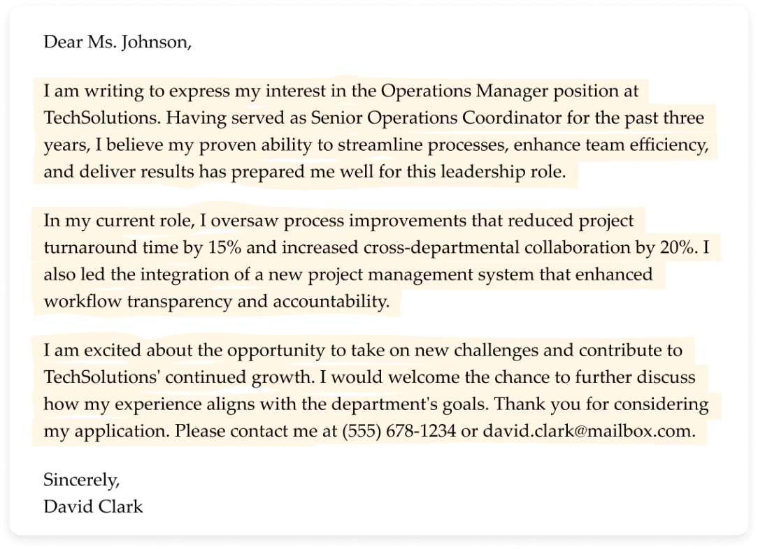 - Be Specific: Avoid vague language and aim for clarity in your cover letter. Skip generic statements like "I'm a good fit" and focus on concrete examples.