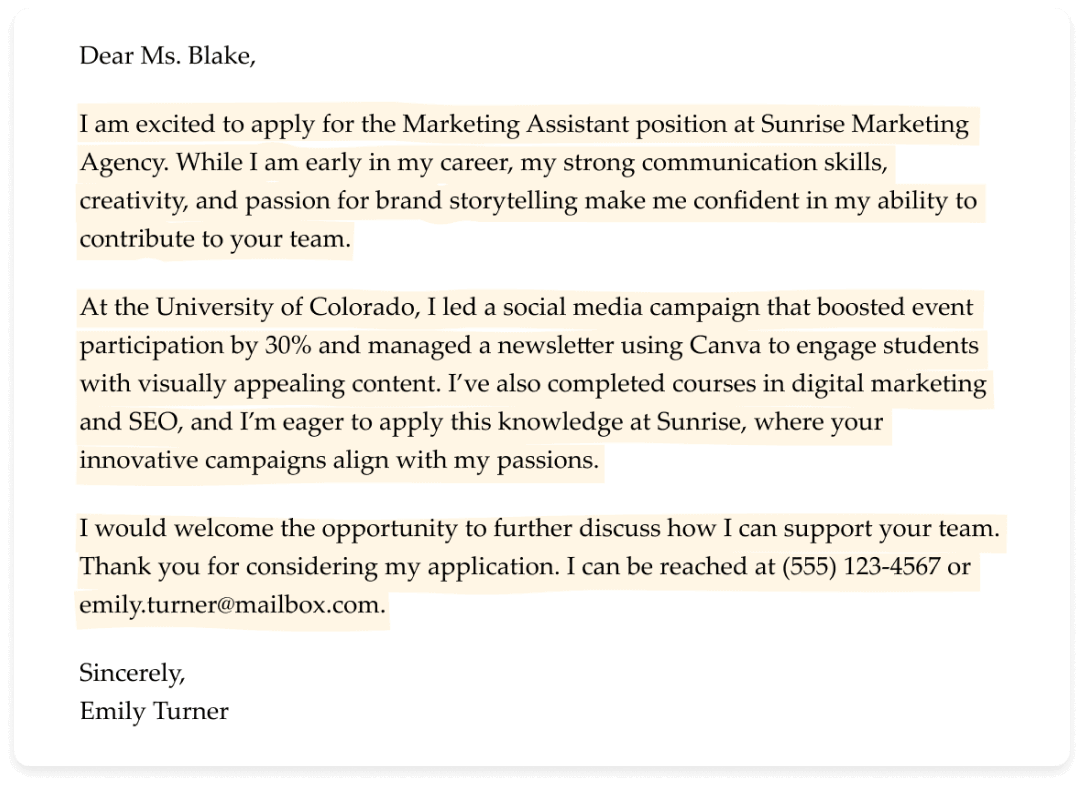 Writing a cover letter as an entry-level candidate can feel daunting. Without work experience or achievements, you might wonder what to include. But here's the bright side - You can emphasize these points instead: